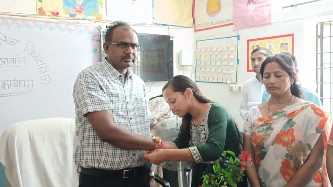 महराजगंज: जिलाधिकारी संतोष कुमार शर्मा ने बुधवार को कस्तूरबा गांधी बालिका विद्यालय का निरीक्षण किया। इस दौरान छात्राओं ने जिलाधिकारी को राखी बांधी और उनके साथ मध्याह्न भोजन कर रक्षाबंधन का पर्व मनाया। डीएम के आगमन से बच्चियों के चेहरे खिल उठे।